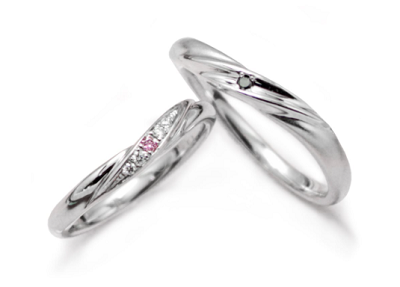 独特な曲線を描く美しいカーブと、丸みを帯びたフォルムが印象的なマリッジリングになります。その形状は、デザイン的なアイキャッチであると同時に、指への着け心地においてもさやしいフィット感を実現しているとアピールされています。レディス向けにはピンクダイヤモンドがあしらわれており、メンズ向けはブラックダイヤモンドまたはホワイトダイヤモンドのいずれかが、好みに応じて選べるという方式になっているそうです。