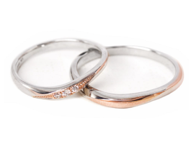 プラチナリングをベースに、ピンクゴールドのカラーリングを施すことで、シンプルさのなかに洗練された上品さを醸し出す雰囲気を放っています。レディス向けは3石のダイヤモンドをメインとして、その両サイドに、繊細なミルグレインを施すことで、装飾部分全体の一体感を表現しているとアピールされています。メンズ向けは、ピンクゴールドのカラーリングを活かしたシンプルデザイン。オシャレな大人のカップルにピッタリと推奨されています。
