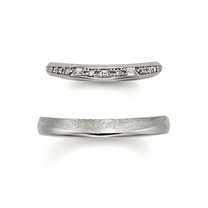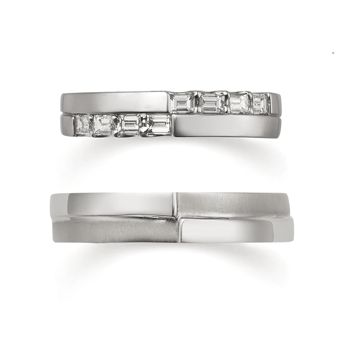 上のリングはプリンセスカットを贅沢に並べたエタニティタイプの結婚指輪です。プリンセスカットとは、知性と気品がある、高貴でプリンセスのような女性にふさわしいカットのダイヤモンドのことです。一般的なダイヤモンドの形に比べ、プリンセスカットのダイヤは、中央から四方へ向けてキラキラと強い輝きを放つのが特徴です。下のリングは、ブラックダイヤをあしらったシックな印象の結婚指輪です。表面には、艶消し加工がされており、普段使いにも違和感のないリングです。