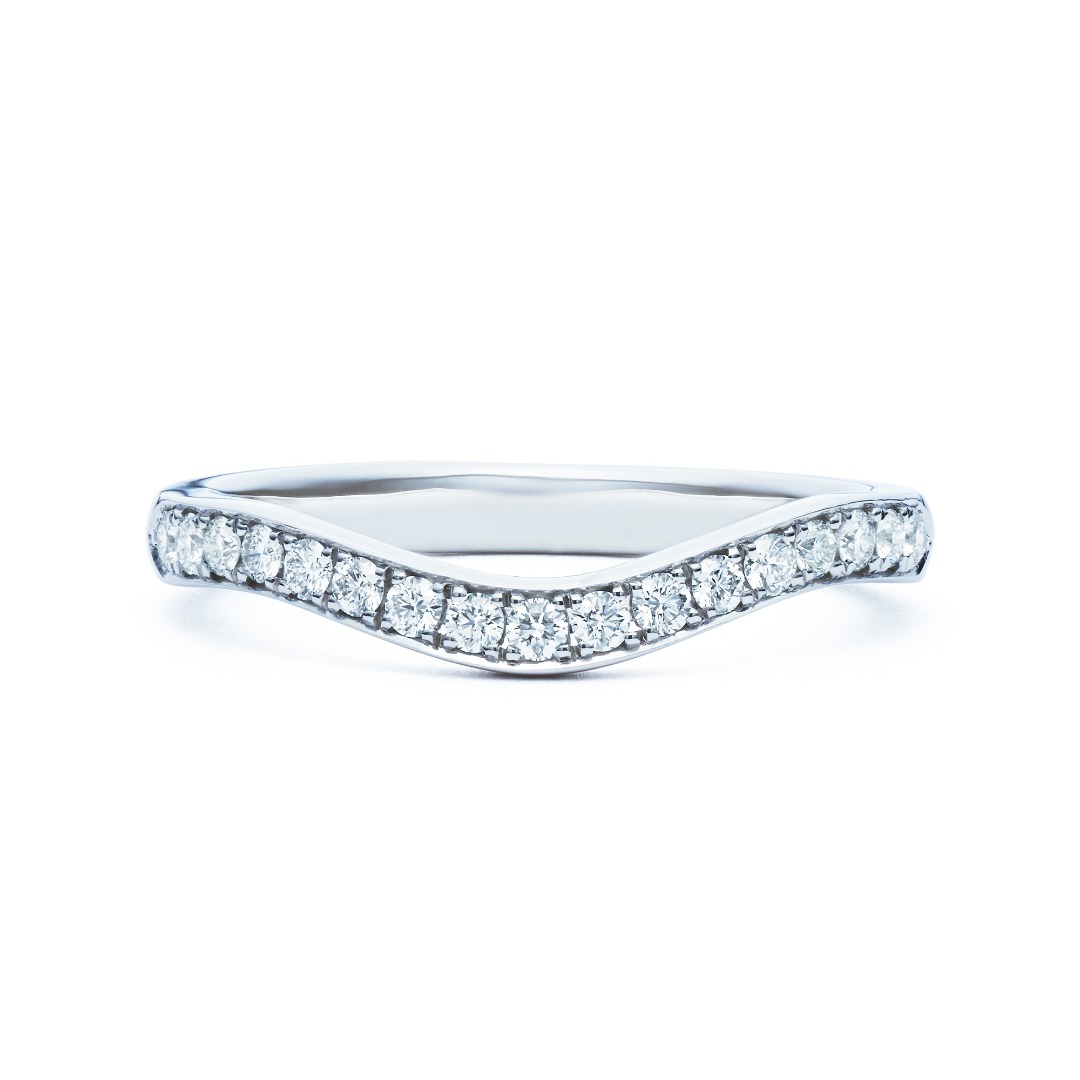 カタログ番号18Dの結婚指輪です。緩やかなV字のウェーブによって、指が美しく見えます。アームの素材はプラチナです。ダイヤが、埋め込まれるようにセッティングされているため、衣服や髪などに引っかかりにくくなっています。いつも結婚指輪を身に付けていたいという気持ちに応えてくれるリングです。